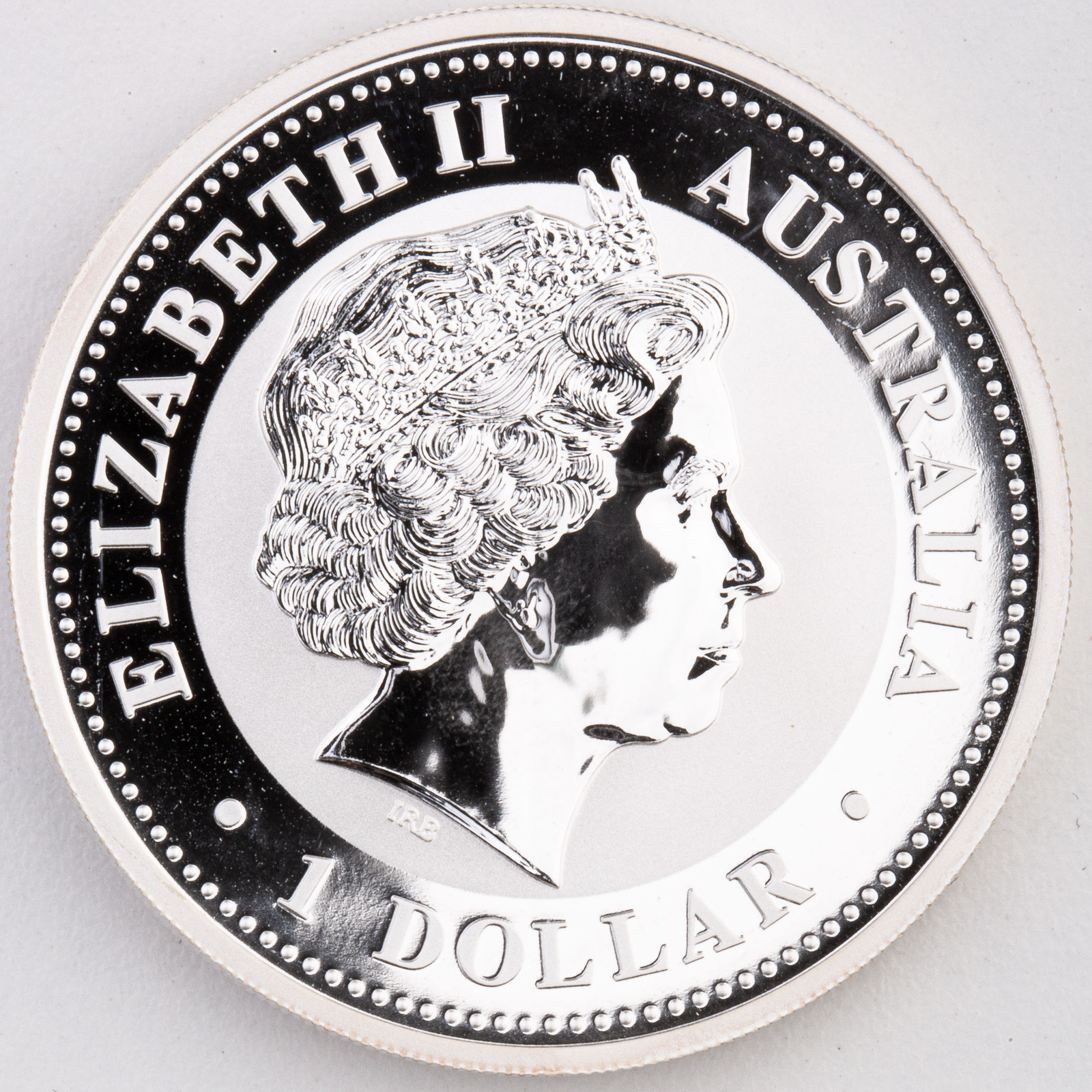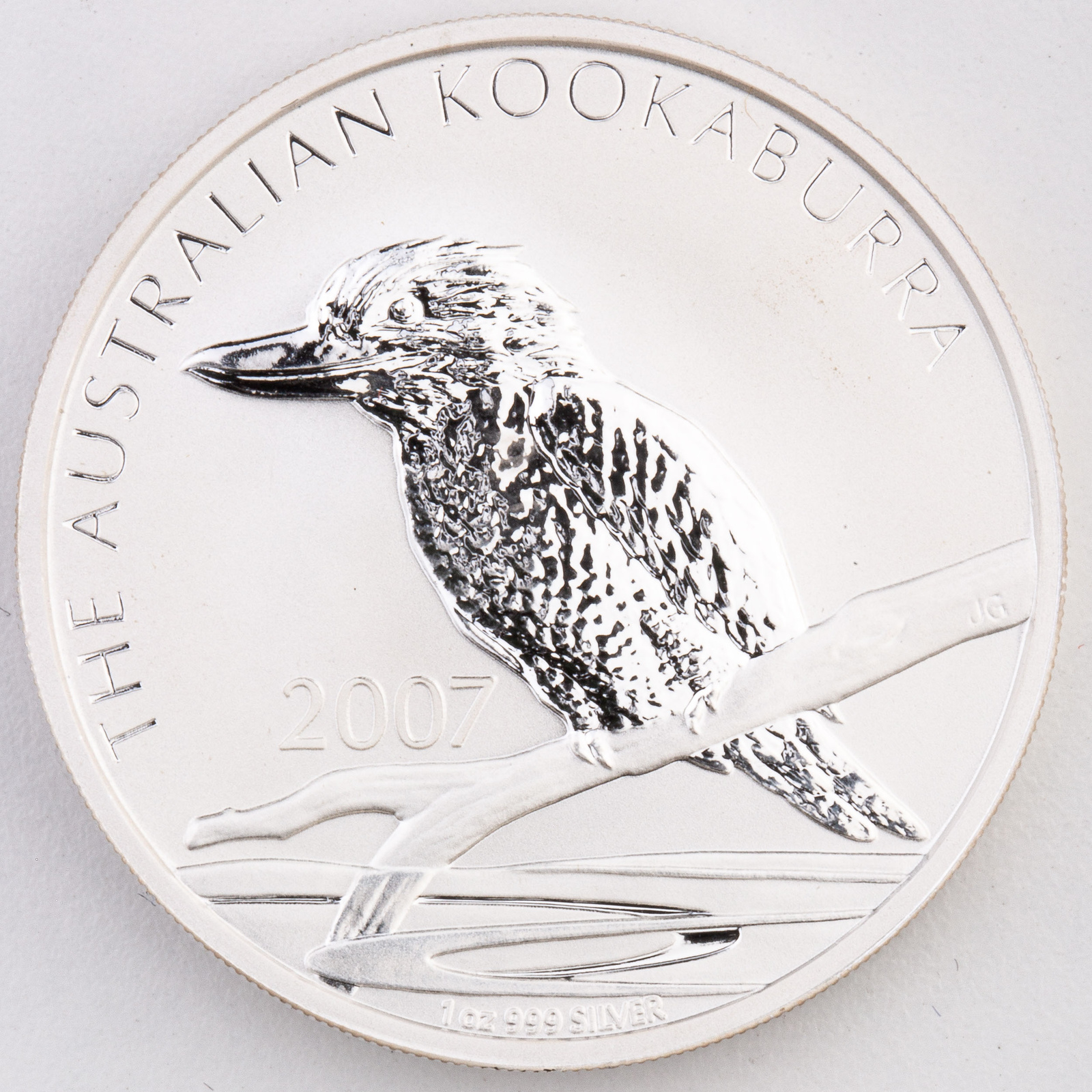 - Sebrny australijski Kookaburra z 2007 roku o nominale 1 dolara.