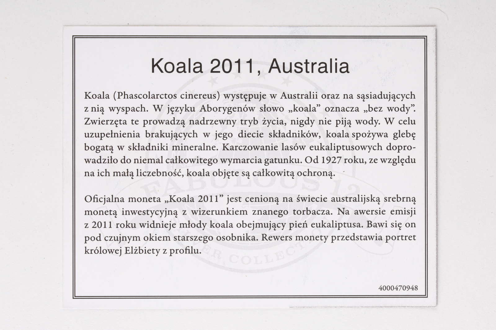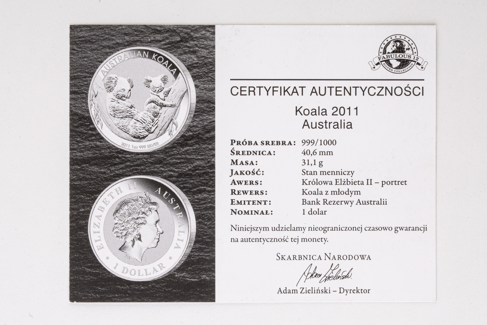 • Srebrna moneta australijski Koala z młodym z 2011 roku o nominale 1 dolara.