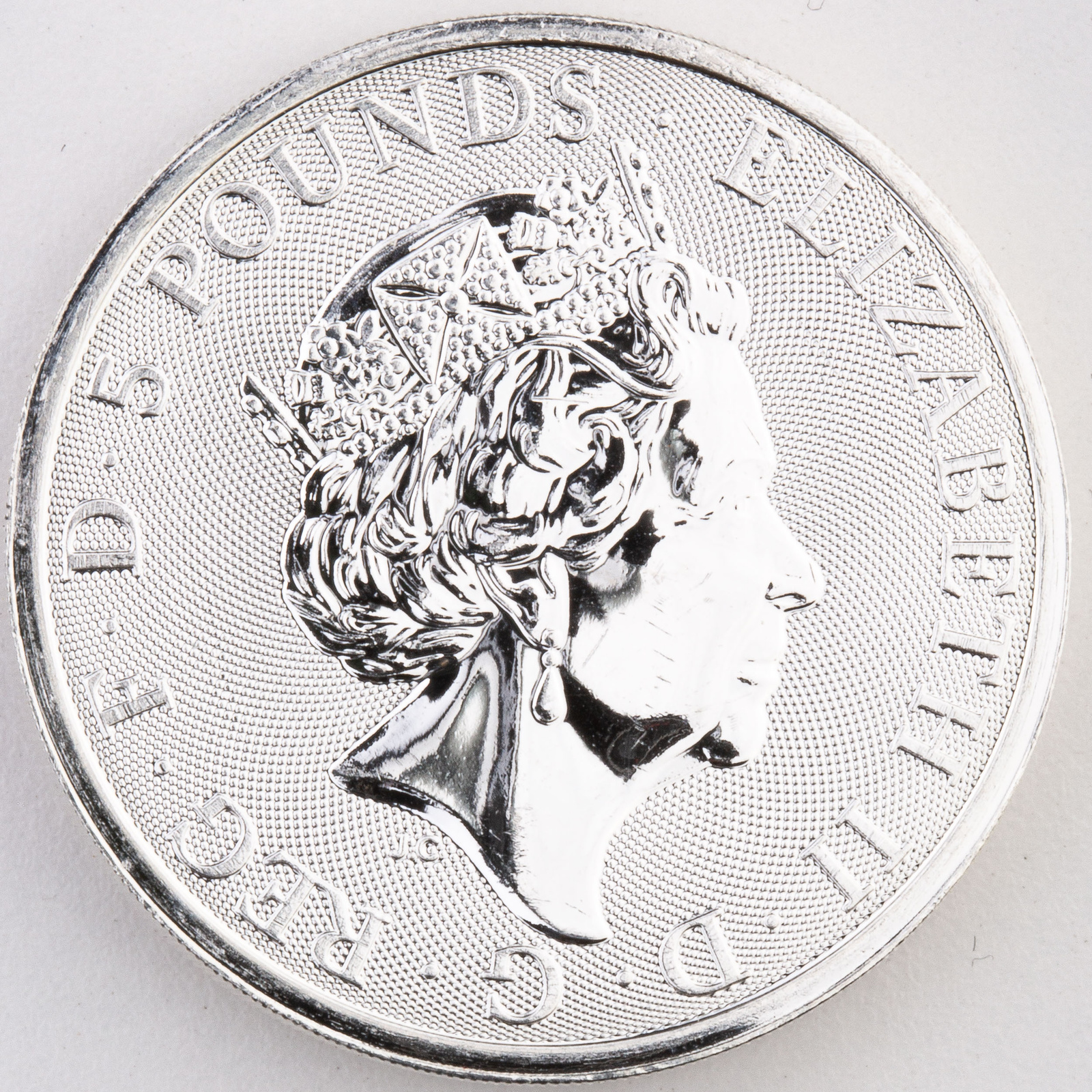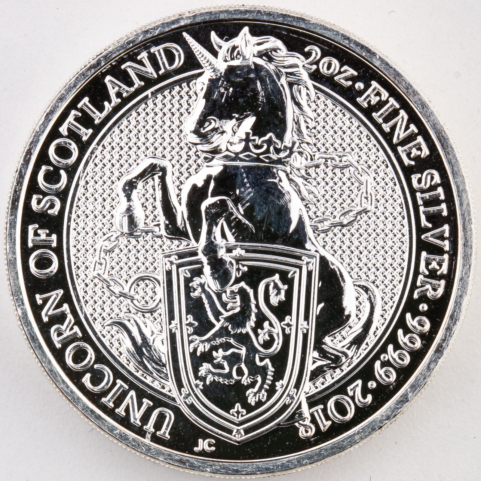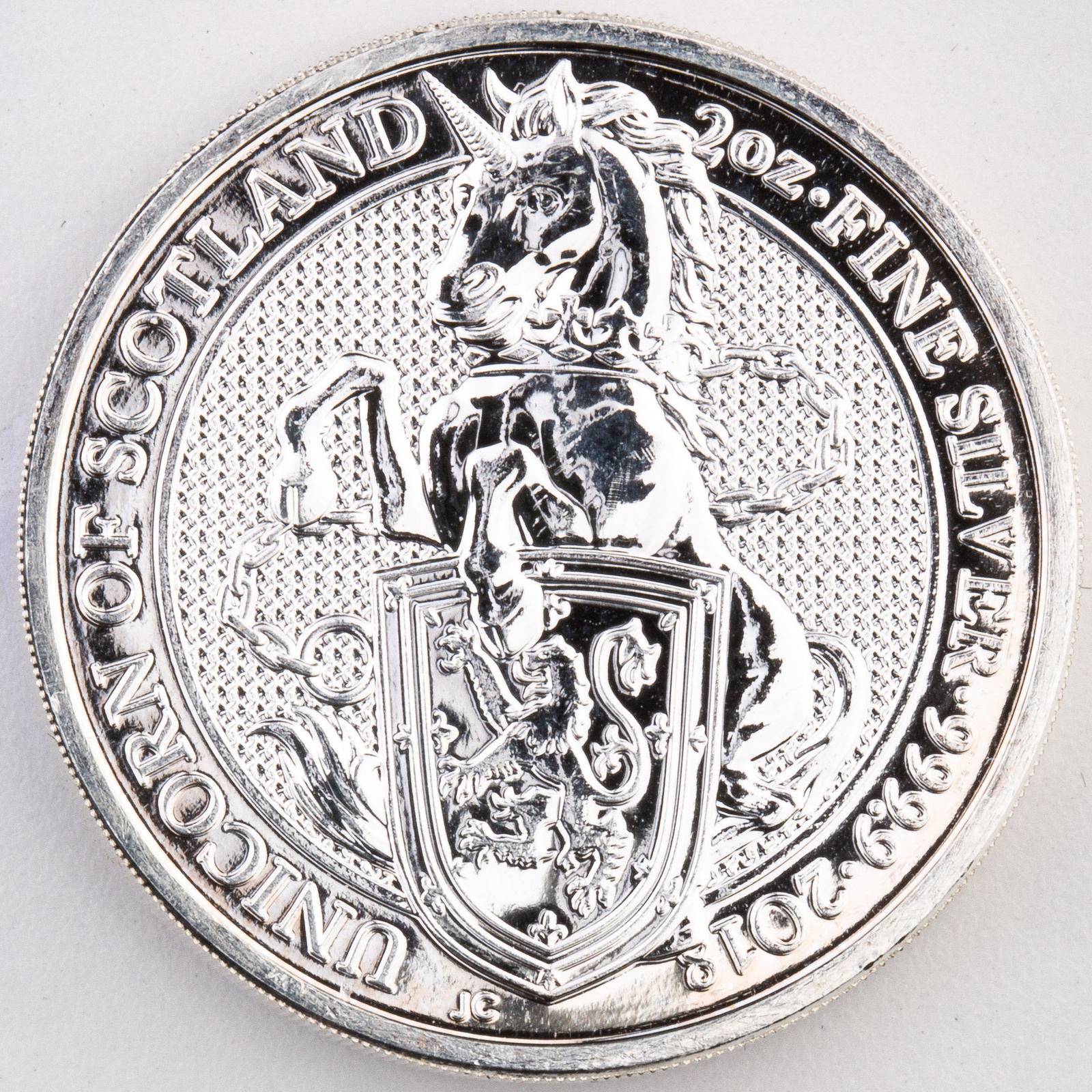 Srebrna moneta 2 uncje o próbie Ag 999 - Wielka Brytania 5 funtów 2018 - Bestie Królowej - Jednorożec Szkocji.
